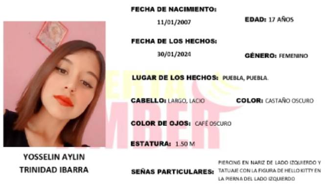 Puebla, Pue.- La Fiscalía General de Puebla activó la Alerta Amber para la búsqueda y localización de la adolescente Yosselin Aylin Trinidad Ibarra, de 17 años de edad.