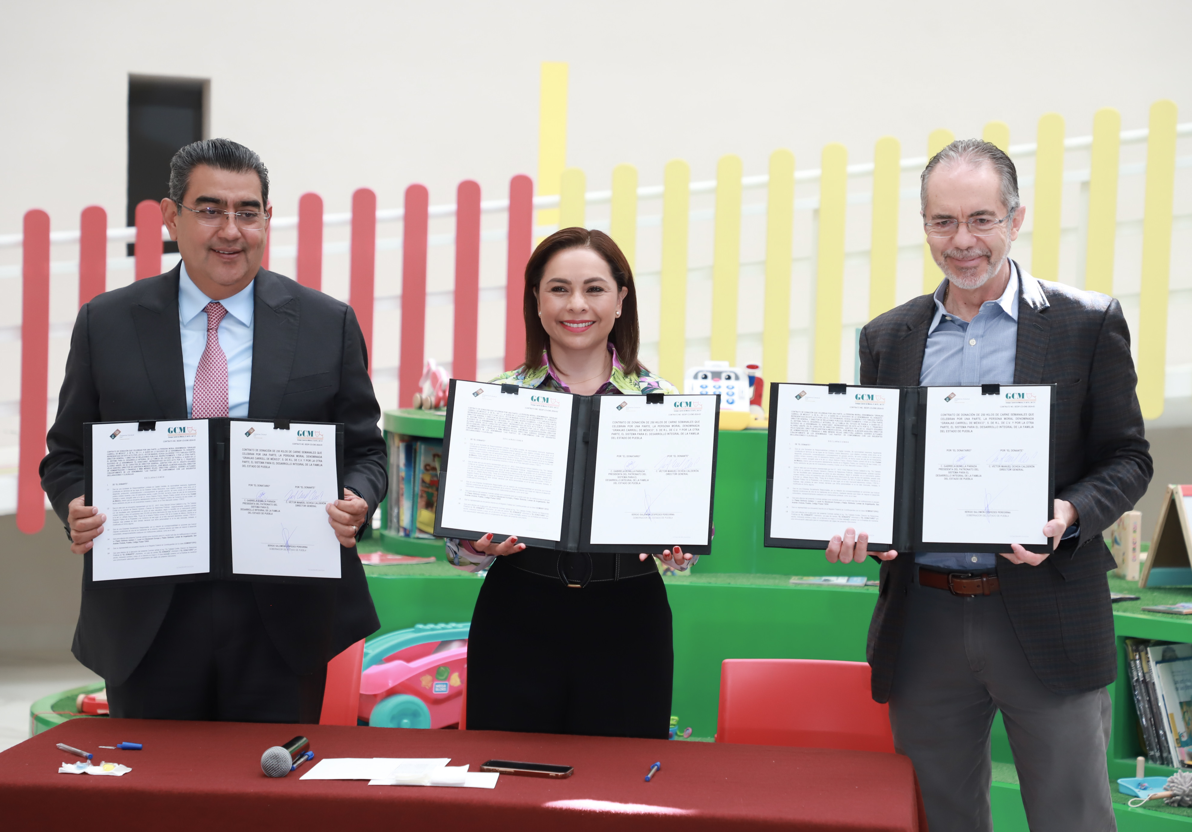 San Andrés Cholula, Pue.- En beneficio de las niñas, niños, adolescentes y adultos mayores bajo resguardo del Sistema Estatal DIF, el gobernador Sergio Salomón; la presidenta honoraria del Patronato del organismo, Gaby Bonilla y directivos de la empresa Granjas Carroll, firmaron un contrato de donación para el otorgamiento de 250 kilogramos de carne de manera semanal a centros de asistencia social.