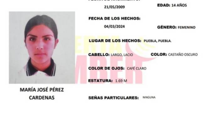 Puebla, Pue.- La Fiscalía General de Puebla activó la Alerta Amber para la búsqueda y localización de la adolescente María José Pérezcárdenas, de 14 años de edad.