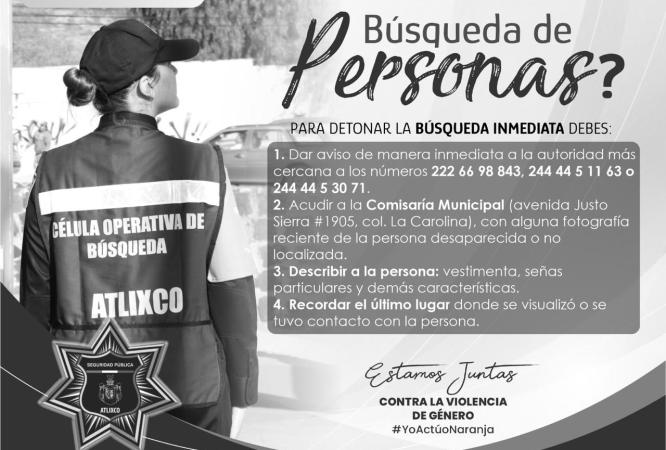 ¿Sabías que Atlixco cuenta con una Célula de Búsqueda de Personas?, integrada por elementos de seguridad pública que colaboran en la búsqueda y localización de personas reportadas como desaparecidas.