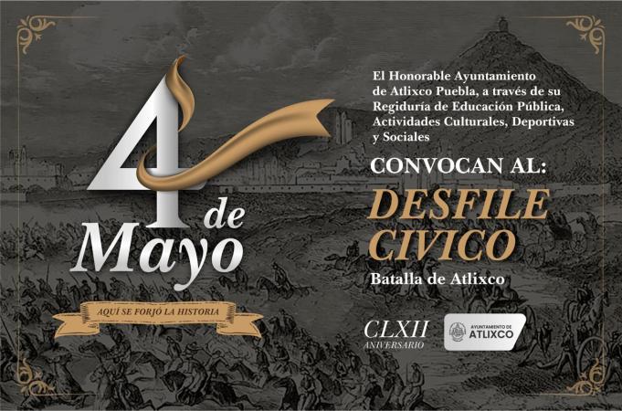 Atlixco, Pue.- Con motivo del 162º Aniversario de la Batalla del 4 de mayo, el Ayuntamiento de Atlixco, a través de la Regiduría de Educación Pública, Actividades, Culturales, Deportivas y Sociales, invita a las escuelas públicas y privadas de Educación Primaria, Secundaria, Educación Media Superior y Superior, a participar en el Desfile Cívico: ¡Por la defensa actual de la Soberanía Nacional!