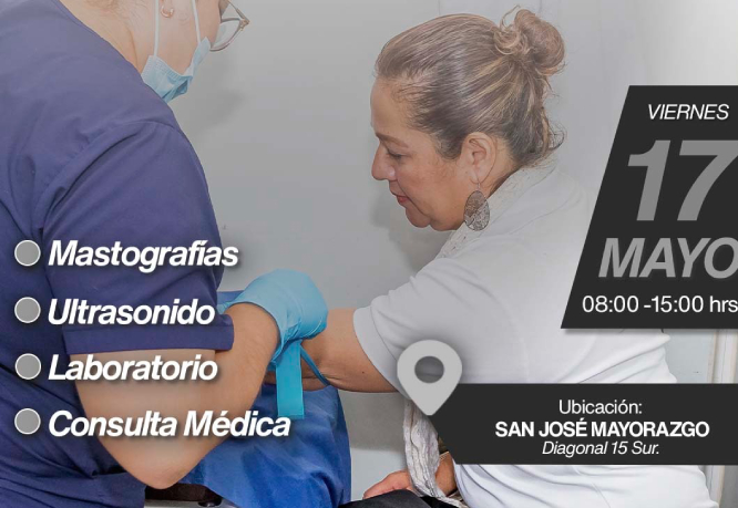 Asimismo, en la colonia San José Mayorazgo, Diagonal 15 Sur, se contará con servicio de mastografías y consulta médica, ultrasonido y laboratorio, también de 8:00 a 15:00 horas.