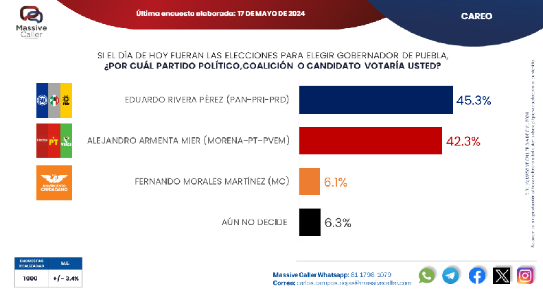 Puebla, Pue.- Si hoy fueran las elecciones en el estado de Puebla, el ganador para la gubernatura sería Eduardo Rivera Pérez, candidato de la coalición “Mejor Rumbo para Puebla”, por una diferencias de tres puntos porcentuales frente al segundo lugar, Alejandro Armenta Mier, candidato de la coalición “Sigamos Haciendo Historia , de acuerdo con el resultado de la encuesta realizada por la empresa Massive Caller, el pasado 17 de mayo.