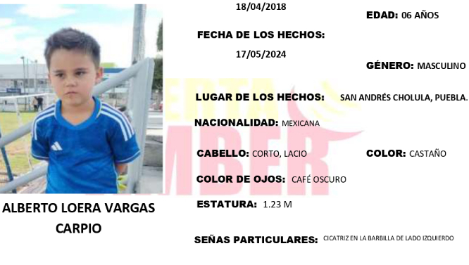 San Andrés Cholula, Pue.- La Fiscalía General de Puebla activó la Alerta Amber para la búsqueda y localización del niño Alberto Loera Vargas Carpio, de 6 años de edad.