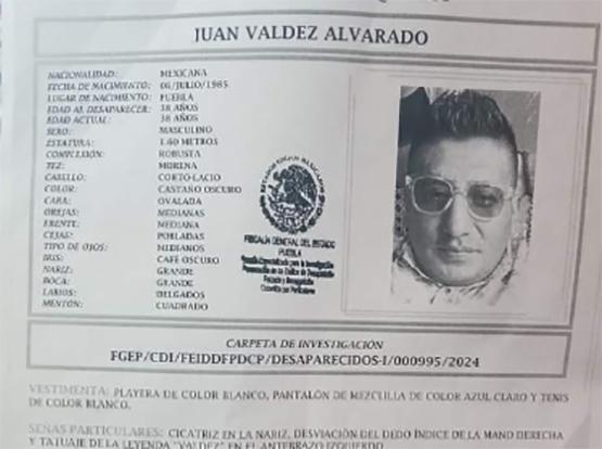San Pedro Cholula, Pue.- La Fiscalía General de Puebla dio a conocer la desaparición de Juan Valdez Alvarado, de 38 años de edad.