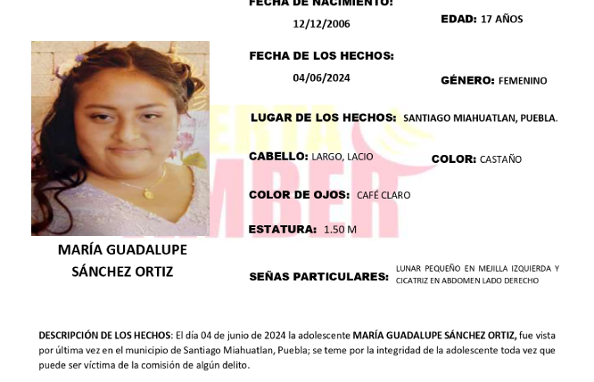 Miahuatlán, Pue.- La Fiscalía General de Puebla activó la Alerta Amber para la búsqueda y localización de la adolescente María Guadalupe Sánchez Ortiz, de 17 años de edad.