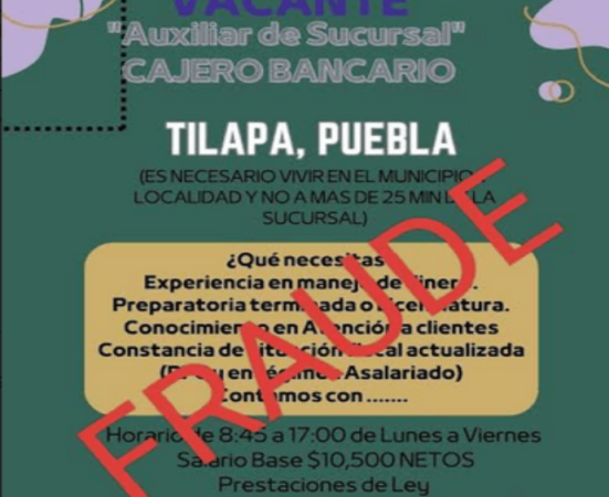 Tilapa. – Autoridades municipales de Tilapa han alertado de una estafa que circula en redes sociales, sobre una supuesta oferta de trabajo en un banco que opera en esta zona, sin embargo, en este lugar no hay ninguna institución bancaria, por lo que piden a la ciudadana en general a mantener alerta.