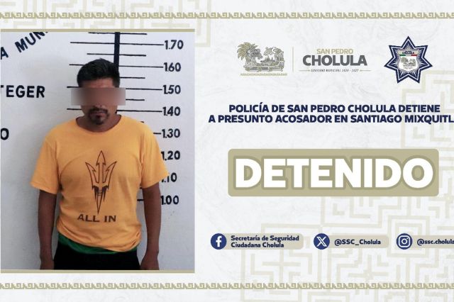 San Pedro Cholula, Pue .- Derivado de un reporte ciudadano, elementos de la Secretaría de Seguridad Ciudadana de San Pedro Cholula (SSC Cholula), acudieron al Barrio de Santiago Mixquitla, donde detuvieron a Rogelio "N", de 36 años, señalado por presuntamente cometer actos de acoso sexual contra mujeres que transitaban sobre la calle 30 Poniente.