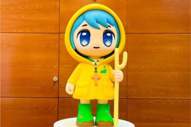Con un diseño que busca conectar con las generaciones más jóvenes, “Luce” se presenta como una peregrina que combina elementos tradicionales y modernos: un k-way amarillo, botas llenas de tierra y un bastón de peregrino.