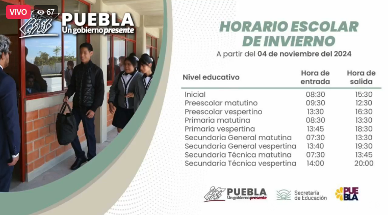 Puebla, Pue.- A partir de mañana, lunes 4 de noviembre, comienza el horario escolar de invierno en todas las escuelas públicas, desde educación inicial hasta secundaria.