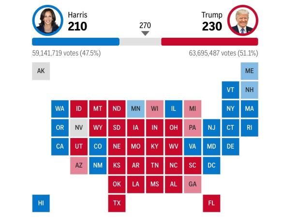 Al corte de las 23:36 horas, Donald Trump se mantiene a la cabeza en las elecciones presidenciales en Estados Unidos, manteniendo una ventaja, con 246 votos sobre los 182 que tiene Kamala Harris.