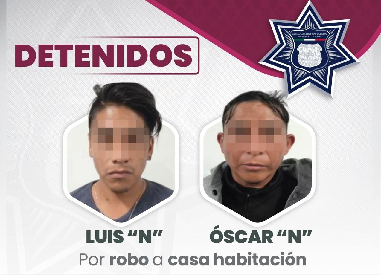 Puebla, Pue.- La Secretaría de Seguridad Ciudadana (SSC) detuvo a Óscar “N.” y Luis “N”, por su presunta participación en el robo a una casa habitación al suroriente de la capital poblana, los señalados cuentan con antecedentes penales.