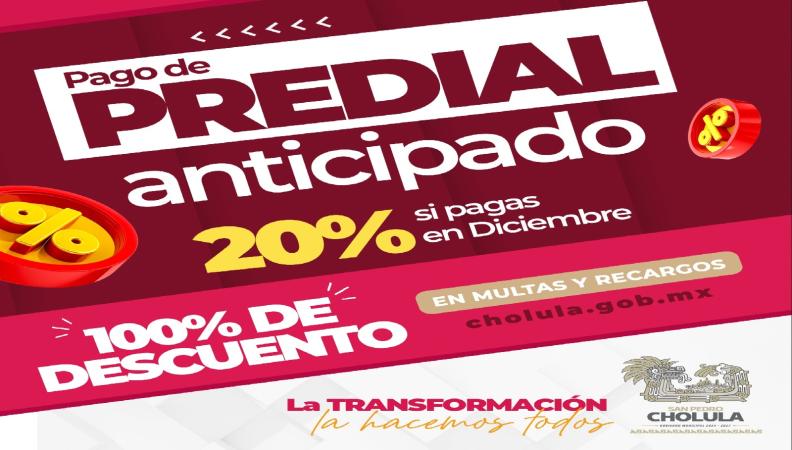 San Pedro Cholula, Pue.- El Gobierno de San Pedro Cholula, presidido por Tonantzin Fernández, anunció los descuentos aprobados para las y los cholultecas que acudan a pagar el impuesto predial, los cuales tuvieron un incremento, respecto al año pasado.