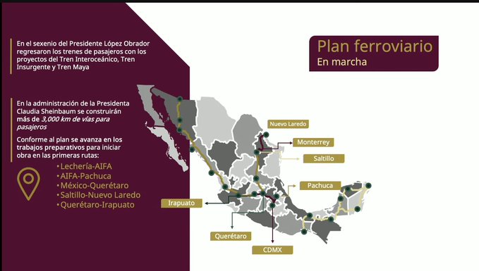 Entre los proyectos anunciados destacan el tramo AIFA-Pachuca, que iniciará en marzo, seguido por la ruta México-Querétaro en abril, y las líneas Querétaro-Irapuato y Saltillo-Nuevo Laredo, ambas programadas para julio.
