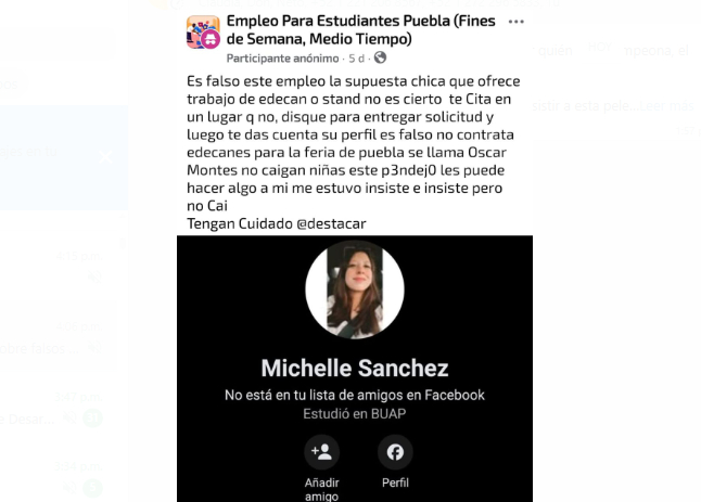 "Es falso este empleo la supuesta chica que ofrece trabajo de edecán o stand no es cierto te cita en un lugar que no", escribió.