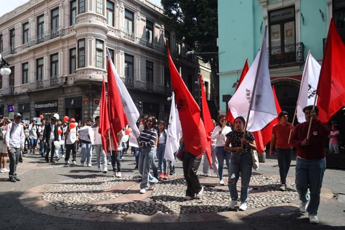 Puebla, Pue.- Integrantes de la Federación Nacional de Estudiantes Revolucionarios Rafael Ramírez (FNERRR), llevó a cabo la mañana de este viernes 23 de mayo una marcha con motivo de sus 26 años de lucha.