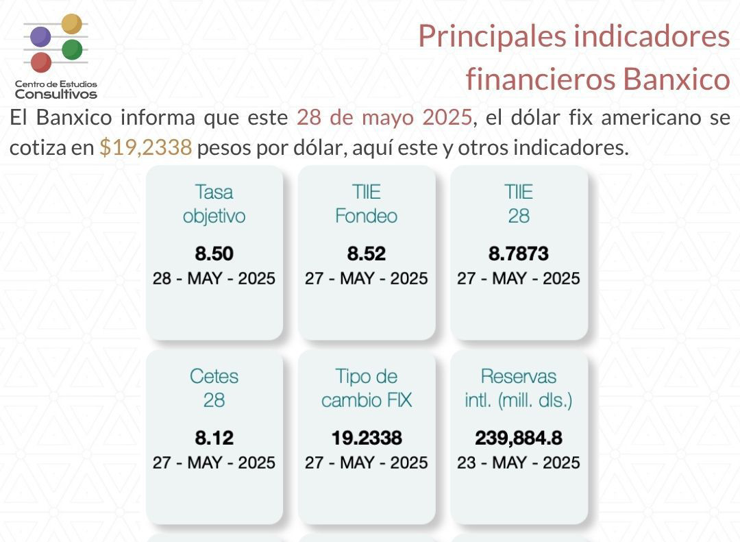 El Centro de Estudios Consultivos dio a conocer que el Banco de México (Banxico) publicó los indicadores financieros correspondientes al 28 de mayo de 2025. En el informe, destaca que el tipo de cambio FIX del dólar estadounidense se cotiza en $19.2338 pesos por dólar.