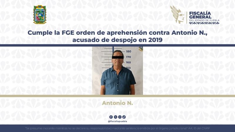 Puebla, Pue.- La Fiscalía General del Estado de Puebla informa que, en atención a un mandato emitido por un Juez de Control, se dio cumplimiento a una orden de aprehensión en contra de Antonio N., por su probable responsabilidad en la comisión del delito de despojo denunciado el 26 de julio de 2019.
