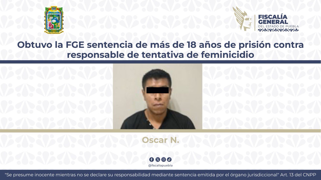 Huehuetla, Pue.- Con base en el caudal probatorio aportado por la Fiscalía General del Estado, se acreditó que Oscar N., es penalmente responsable del delito de feminicidio en grado de tentativa, ocurrido en Huehuetla, Puebla, por lo que obtuvo una sentencia en su contra de 18 años, 4 meses de prisión.