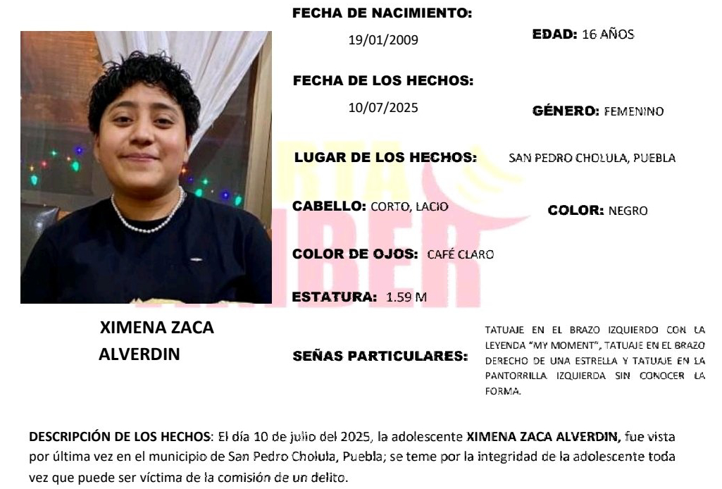 La Fiscalía General del Estado de Puebla activó una Alerta Amber para localizar a Ximena Zaca Alverdin, una adolescente de 16 años que fue vista por última vez el pasado 10 de julio de 2025 en el municipio de San Pedro Cholula. Las autoridades temen por su integridad física y psicológica, ya que podría ser víctima de la comisión de un delito.