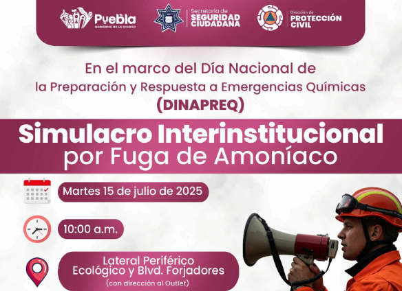 Puebla, Pue.- El Día Nacional de la Preparación y Respuesta a Emergencias Químicas (DINAPREQ) es el escenario para que la Secretaría de Seguridad Ciudadana y la Dirección de Protección Civil de Puebla lleven a cabo un simulacro interinstitucional por fuga de amoníaco.