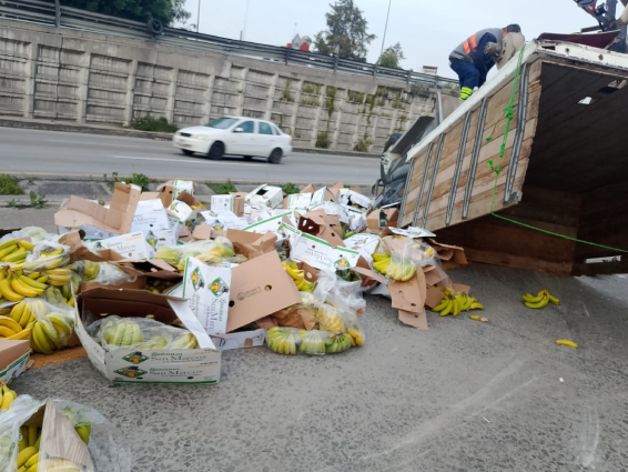 Las cajas llenas de plátano quedaron completamente volcadas sobre la vialidad por lo que incluso los tripulantes de la camioneta con algunas lesiones, bajaron a rescatar lo poco que podían del producto para poder llevárselo.