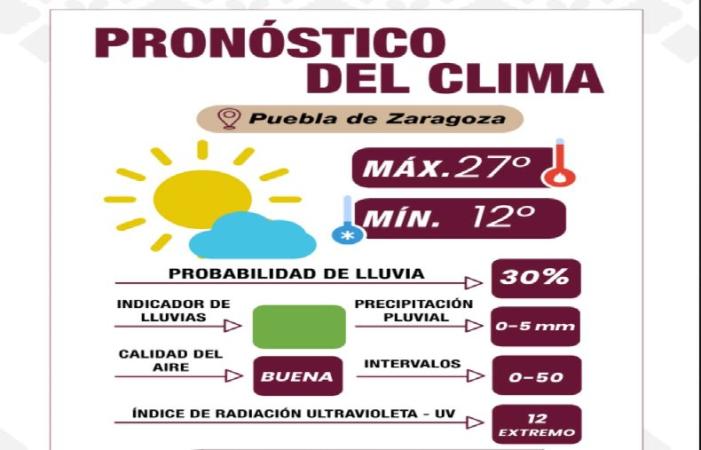 Puebla, Pue.- Se prevé un día mayormente soleado en la capital poblana, con ligera nubosidad durante la tarde y una baja probabilidad de lluvias, con acumulaciones entre 0 y 5 mm. Las temperaturas oscilarán entre los 12°C como mínima y 27°C como máxima.