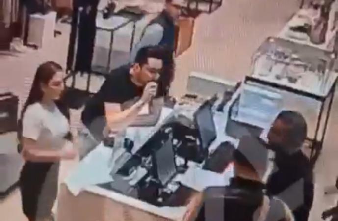 La fémina, que se presume es su pareja, se dirigió hacia la entrada para llamar a dos escoltas, quienes ingresan de manera intimidante y rodean al empleado que se encontraba con otra de sus compañeras.