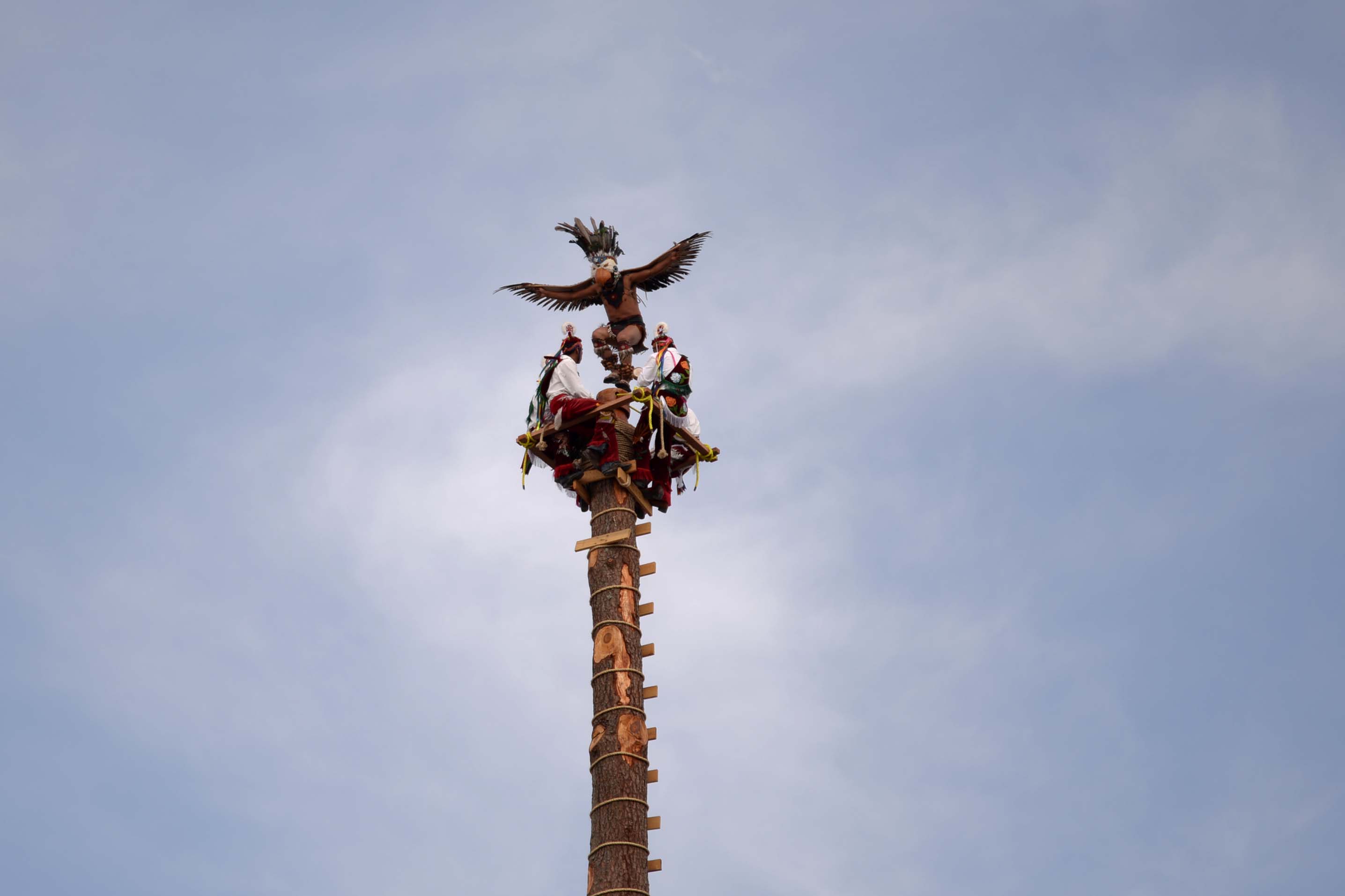 Los voladores de Papantla son los encargados de realizar una ceremonia prehispánica originaria de Veracruz que consiste en un vuelo acrobático realizado por 4 hombres alrededor de un mástil, al ritmo de la flauta que toca un quinto hombre.