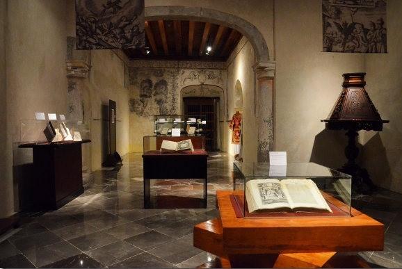 Sobre los elementos expuestos y pertenecientes a la Biblioteca Franciscana, se encuentran exhibidos en distintas vitrinas y son algunos facsimilares y exlibris que recogen momentos importantes para el encuentro de estos dos mundos, como ejemplo está la obra de Pedro de Gante.
