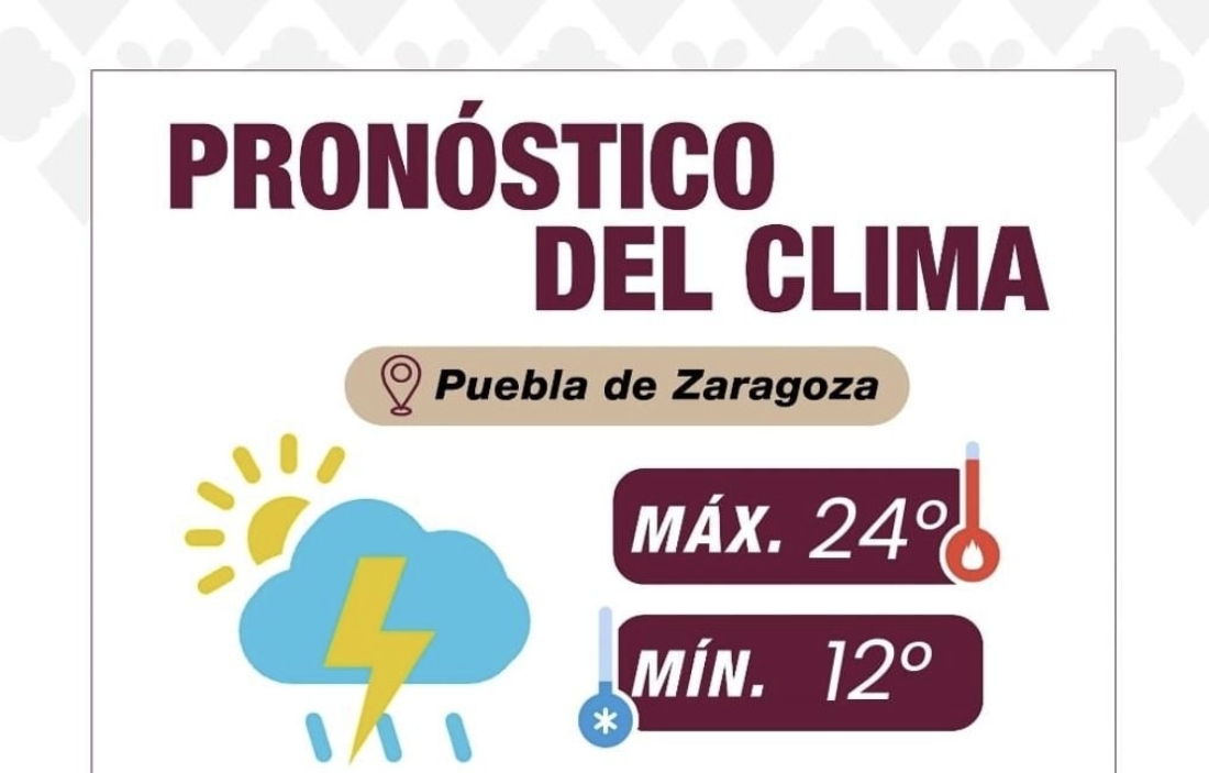 Puebla, Pue.- El Gobierno de la Ciudad, a través de la Dirección de Gestión de Riesgos en materia de Protección Civil de la Secretaría de Gestión y Desarrollo Urbano, informa a la ciudadanía que este día se mantendrá nublado, con probabilidad media de lluvia por la tarde, estimando una acumulación de entre 0 y 5 mm alrededor de las 16:00 horas. Las temperaturas oscilarán entre una mínima de 12°C y una máxima de 24°C, por lo que se recomienda vestir con ropa adecuada para cambios de temperatura.