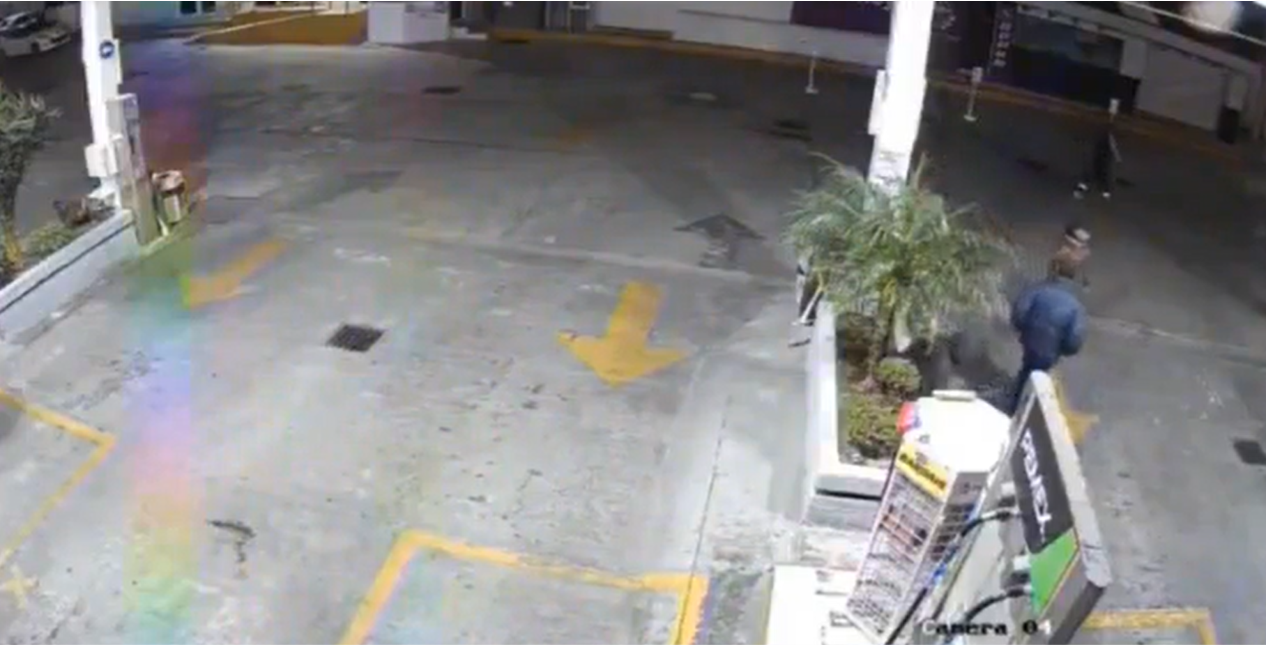Mientras que uno de las personas se queda con el despachador y lequita el dinero y objetos personas, los otros dos salen corriendo como persiguiendo a alguien, después regresan por sus compañeros y se marchan del lugar.