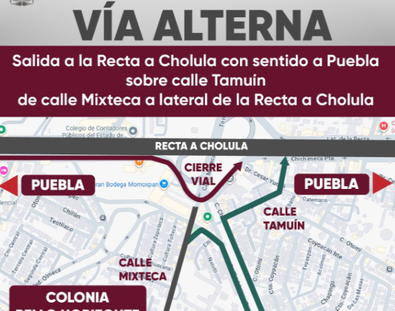 Como alternativa, los automovilistas que se dirijan a Puebla podrán utilizar la calle Tamuín, desde la calle Mixteca hasta la lateral de la Recta a Cholula.
