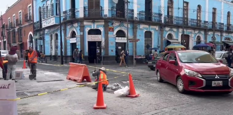 Ahora en esta ocasión la cuadrilla lleva a cabo los trabajos del cambio de lajas sobre avenida Juan de Palafox y 6 Norte, en pleno Centro Histórico, por lo que se reduce un carril.