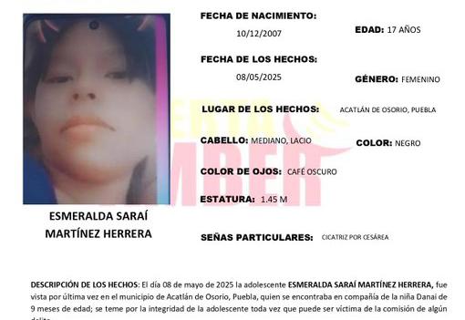 La Fiscalía General del Estado de Puebla activó una Alerta Amber para dar con el paradero de Esmeralda Saraí Martínez Herrera, adolescente de 17 años que fue vista por última vez el 8 de mayo de 2025 en el municipio de Acatlán de Osorio.