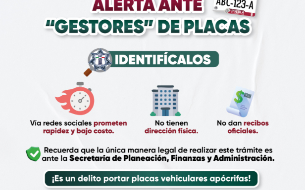 Puebla, Pue.- El Gobierno del Estado de Puebla, a través de la Secretaría de Seguridad Pública (SSP), alerta a la ciudadanía sobre los riesgos de tramitar placas de circulación mediante redes sociales con “gestores o coyotes”.