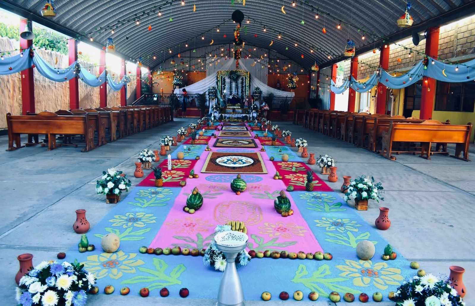 Desde tempranas horas los habitantes elaboran cuadros monumentales y alfombras artesanales utilizando una gran variedad de semillas como amaranto, sorgo, frijol, maíz, semilla de calabaza y cacahuate, cuidadosamente colocadas una a una.