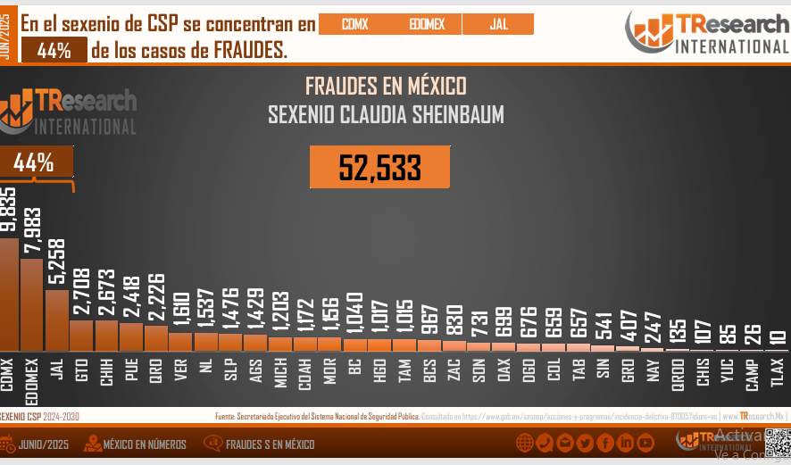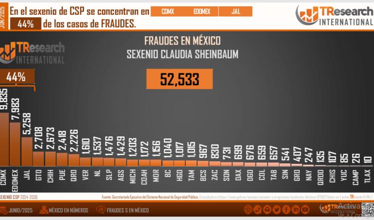 A nivel nacional, de octubre de 2024 a junio de 2025 se han registrado 52,533 denuncias por fraude, de las cuales la Ciudad de México (9,835), Estado de México (7,983) y Jalisco (5,258) concentran el 44% del total.