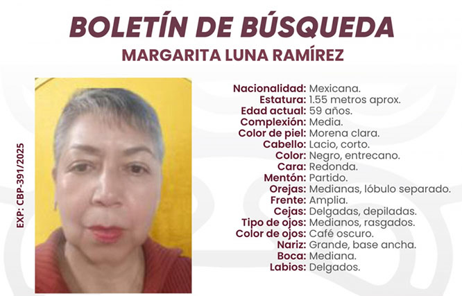 San Pedro Cholula, Pue.- La Comisión de Búsqueda de Personas del Estado de Puebla emitió un boletín para localizar a Margarita Luna Ramírez, de 59 años, quien fue vista por última vez el pasado 7 de agosto de 2025 en la Junta Auxiliar Santiago Momoxpan, municipio de San Pedro Cholula.