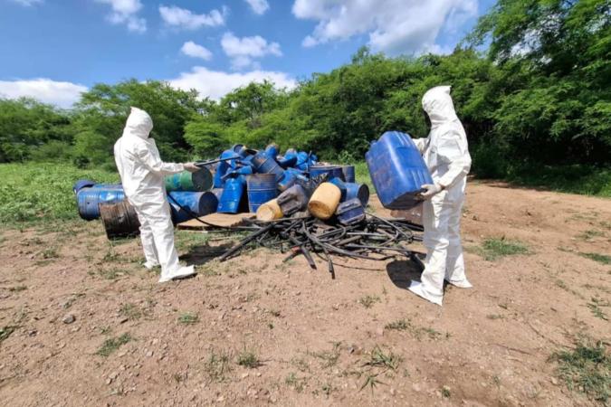 A través de trabajos de reconocimiento vía terrestre, en el marco de la “Operación Búsqueda, Localización y Destrucción de Laboratorios Clandestinos”, el personal localizó seis áreas de concentración de materiales químicos utilizados para la elaboración de drogas sintéticas en las comunidades Potrero de los Ibarra de Abajo, Los Sabinitos, Los Vasitos, El Vino, El Habal y en las inmediaciones de la presa Vinoramas. En Cosalá, se localizó un área en el poblado El Ranchito, donde se aseguró lo siguiente: