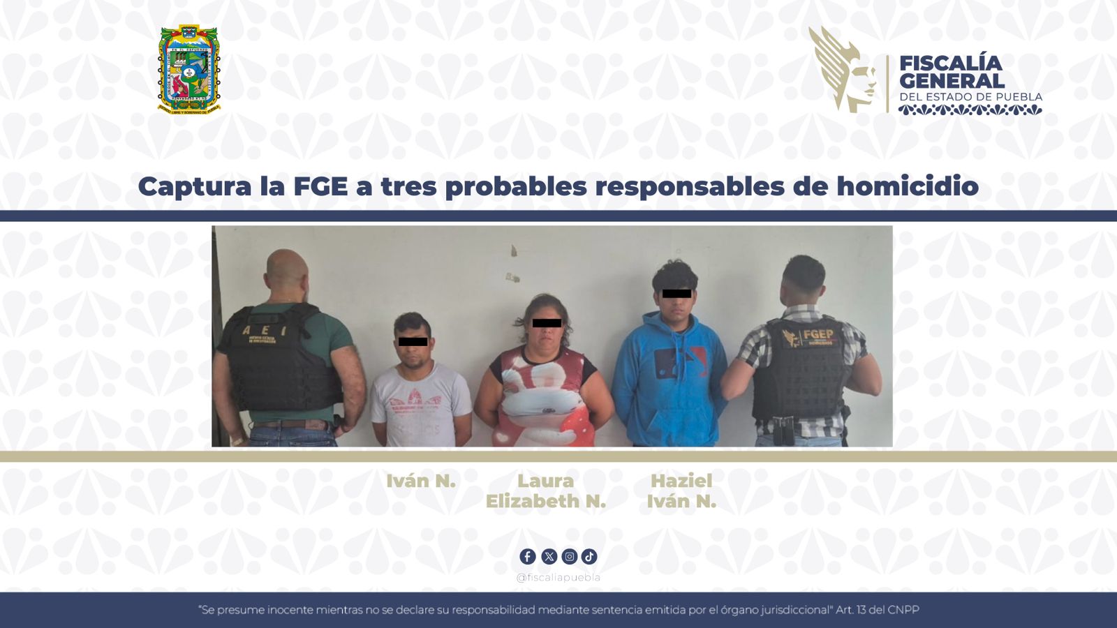 Puebla, Pue.- La Fiscalía General del Estado de Puebla detuvo mediante orden de aprehensión a Laura Elizabeth N., de 35 años, Iván N., de 40 años y Haziel Iván N., de 18 años, presuntamente relacionados con el homicidio de un hombre en inmediaciones de la colonia Galaxia Bosques de Manzanilla de la ciudad de Puebla.
