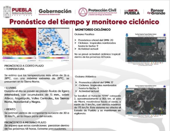 De acuerdo con el pronóstico, se prevén lluvias ligeras con acumulados de 15 milímetros en municipios de Atlixco, la zona de Angelópolis, los Valles Centrales, así como en las Sierras Norte, Nororiental y Negra. Además, se pronostican vientos provenientes del sureste con velocidades de 30 a 35 kilómetros por hora en la mayor parte del territorio poblano.