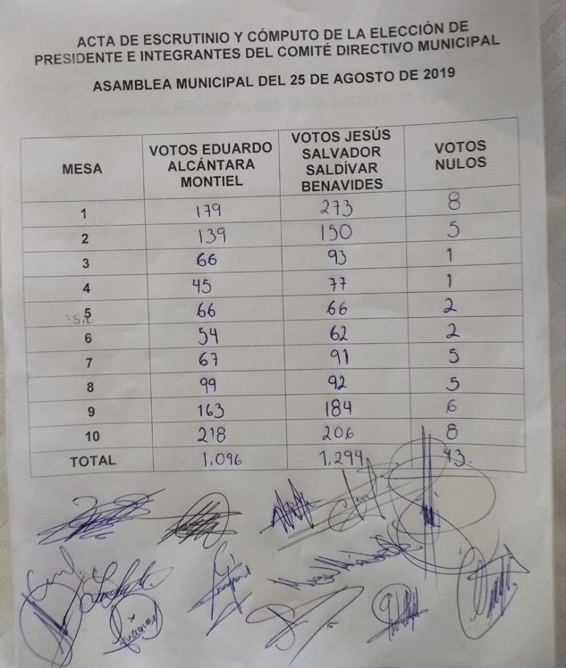 294 se tacharon a favor de Jesús Zaldívar, 1 mil 96 a favor de Eduardo Alcántara y 43 fueron anuladas.