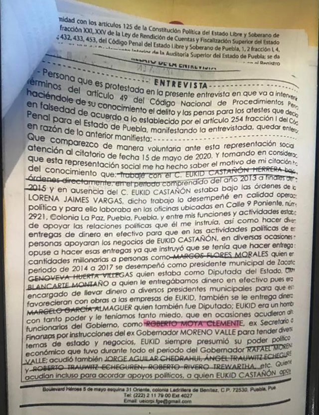 Según sus declaraciones rendidas el 20 de octubre de 2019 ante el agente del Ministerio Público Marco Antonio Sánchez Cid, Eukid Castañón era un hombre con tanto poder que sus oficinas de la calle 9 Poniente número 2921 de la colonia La Paz eran visitadas por políticos y ex funcionarios como Roberto Moya Clemente, Jorge Aguilar Chedraui, Ángel y Roberto Trauwitz Echeguren y Roberto Rivero Trewartha.