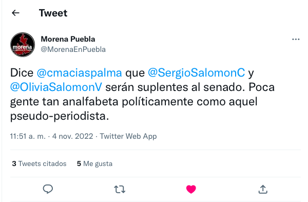 La cuenta oficial de twitter de MORENA Puebla (@MorenaEnPuebla), le ha dedicado al autor de esta columna dos magníficos “tuits”.