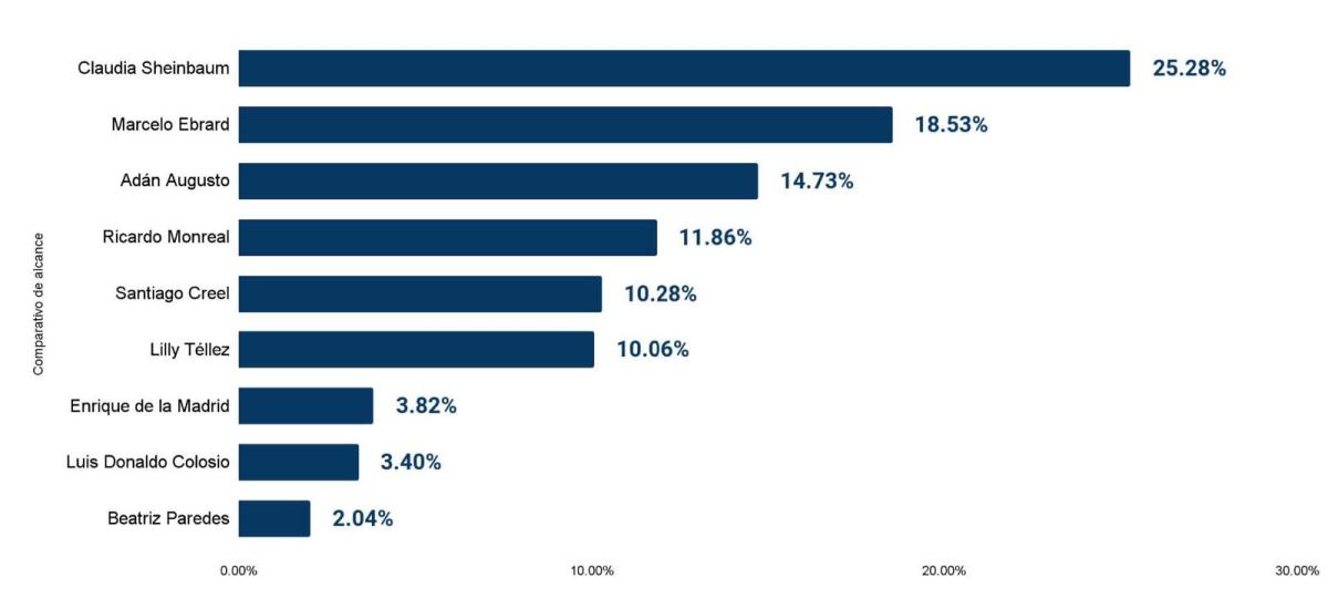 En cuanto a la oposición, en el Comparativo de Alcance, figuran el panista Santiago Creel, Presidente de la Mesa Directiva de la Cámara de Diputados con el 10.28 por ciento, seguido por la panista Senadora de la República Lilly Téllez con 10.06 por ciento.