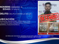 Aseguran a Gerardo acusado de narcomenudeo en Huejotzingo Municipios PueblaDomingo, Junio 11, 2023 - 13:12Se le encontraron 35 bolsas pequeñas con polvo granulado con características de la droga conocida como cristal y más de mil pesos en efectivoLeer más