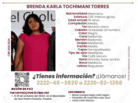 Buscan a Brenda Karla Tochimani Torres, desaparecida en San Pedro Cholula Municipios PueblaLunes, Noviembre 18, 2024 - 00:03Al momento de ser vista por última vez, vestía una blusa de manga larga de color negro, pantalón de mezclilla azul y zapatos tenis color blancoLeer más