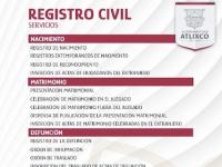 Gratis, estos son los servicios que ofrece el Registro Civil de Atlixco Municipios PueblaJueves, Julio 14, 2022 - 16:34Algunos de ellos son los Registros de Nacimiento, Registros Extemporáneos, Registro de Defunción, Orden de Inhumación y TrasladoLeer más