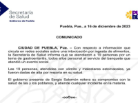 Niega SSA que burócratas se hayan intoxicado en convivio de fin de año Municipios PueblaSábado, Diciembre 16, 2023 - 21:34Los 19 intoxicados en la cena decembrina no eran trabajadores del gobierno estatal, sino de la banquetera, argumentaronLeer más